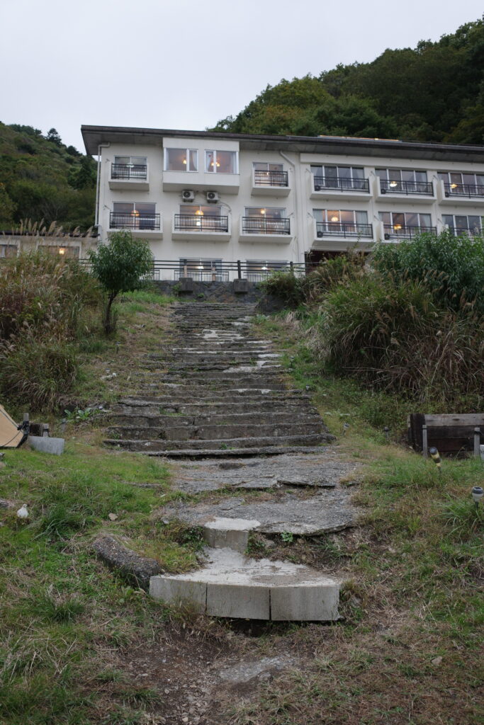 まずキャンプ場に入るために階段を降りる必要があり、